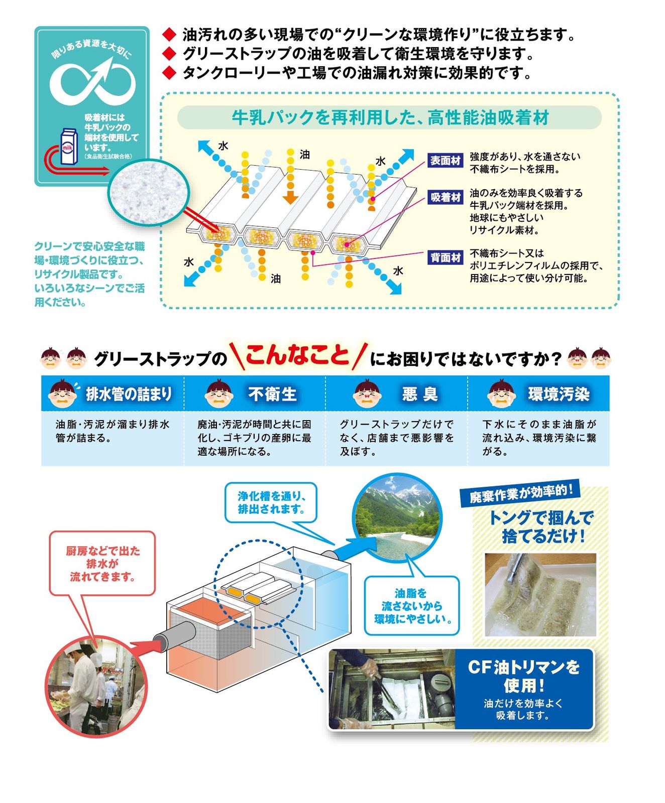 ●牛乳パックを再利用した高性能油吸収材。表面材は強度があり、水を通さない不織布シートを採用。吸着材は油のみを効率良く吸収する牛乳パック端材を採用。環境にもやさしいリサイクル素材。