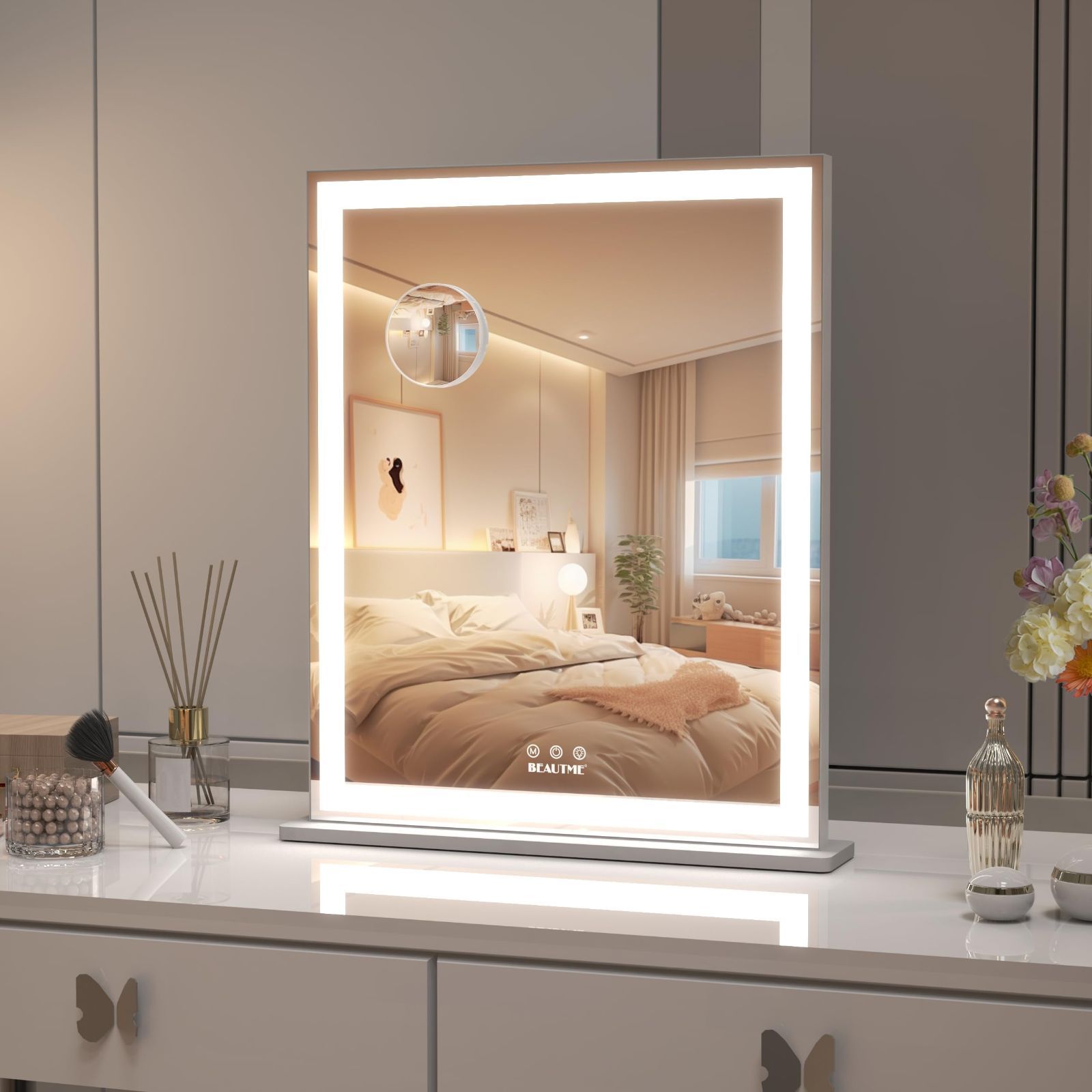 Size 61.2長さ x 52幅 cm_Color シルバー BEAUTME 化粧鏡 女優ミラー 卓上 壁掛け両用 ハリウッドミラー 照明モード 明るさ調節 縦 10倍拡大鏡 61.