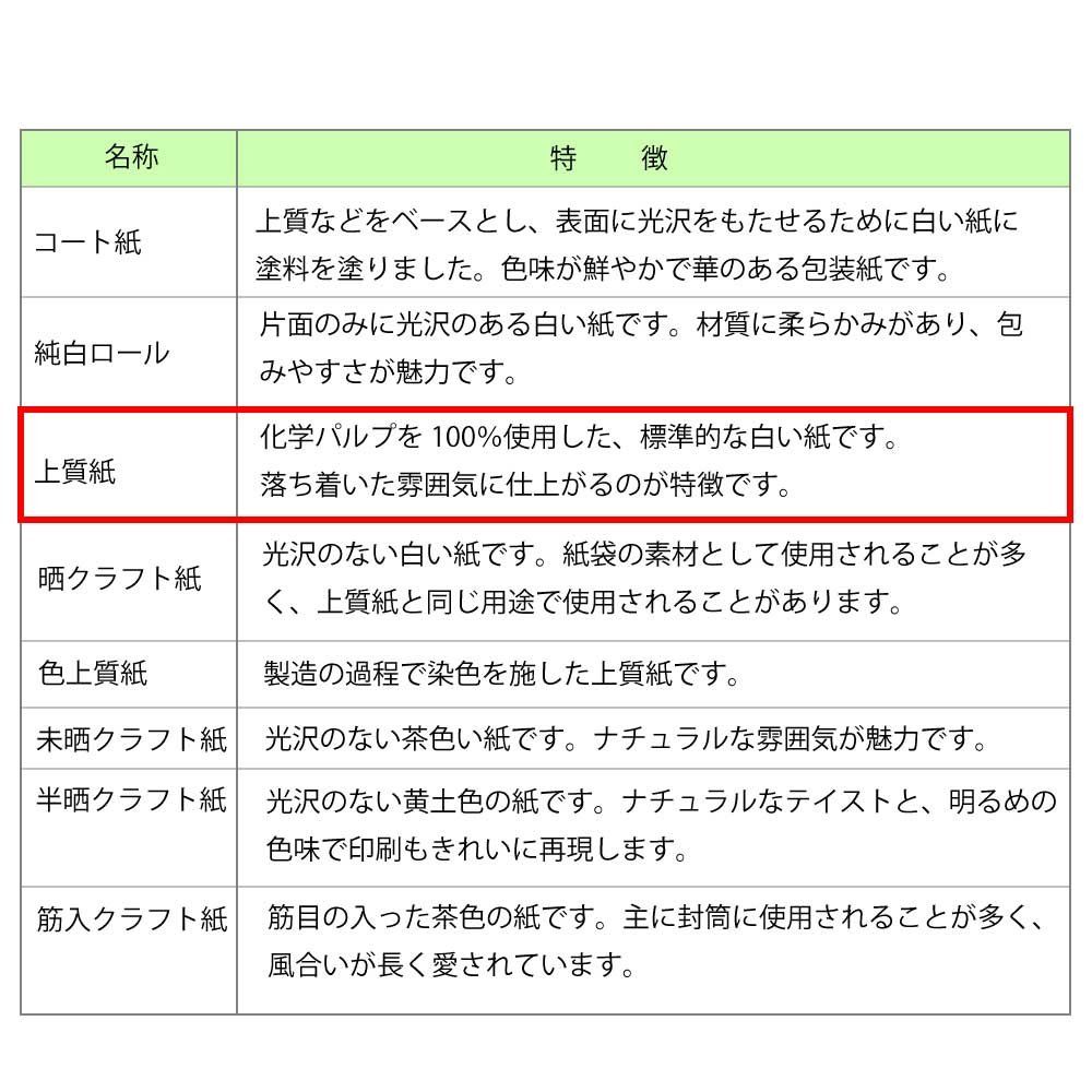 上質紙は原料に化学パルプを使用した白い紙で、表面が落ち着いた雰囲気に仕上がるのが特徴です。