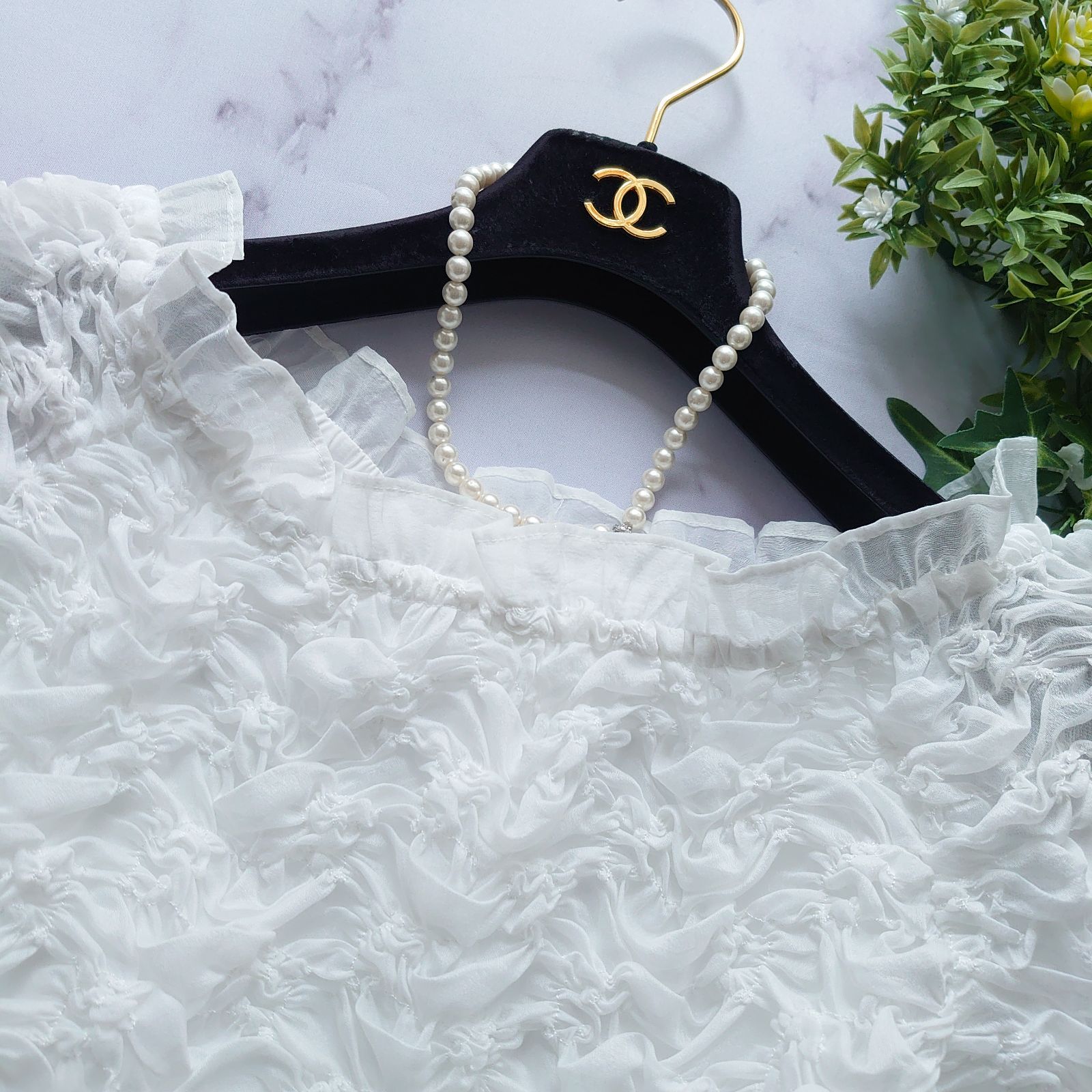 ・オフショルダーとしても着用可能な2WAY仕様で首周りはフリルが華やかさをプラス