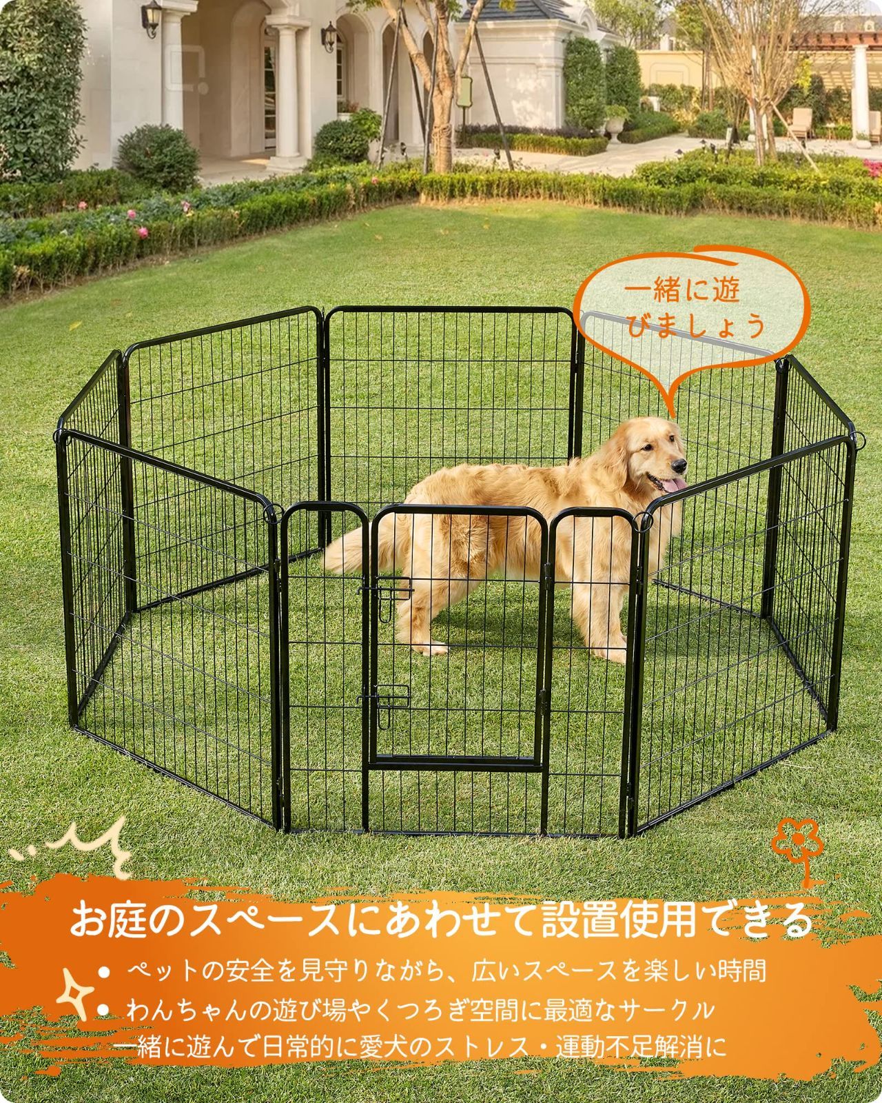 犬サークル 大型犬 中型犬用 ペットフェンス 折り畳み式 スチール製 全成長期使用可 室内外兼用 ペットサークル 複数 パネル 犬ゲージ 組立簡単 高さ80 cm PPK 88 H