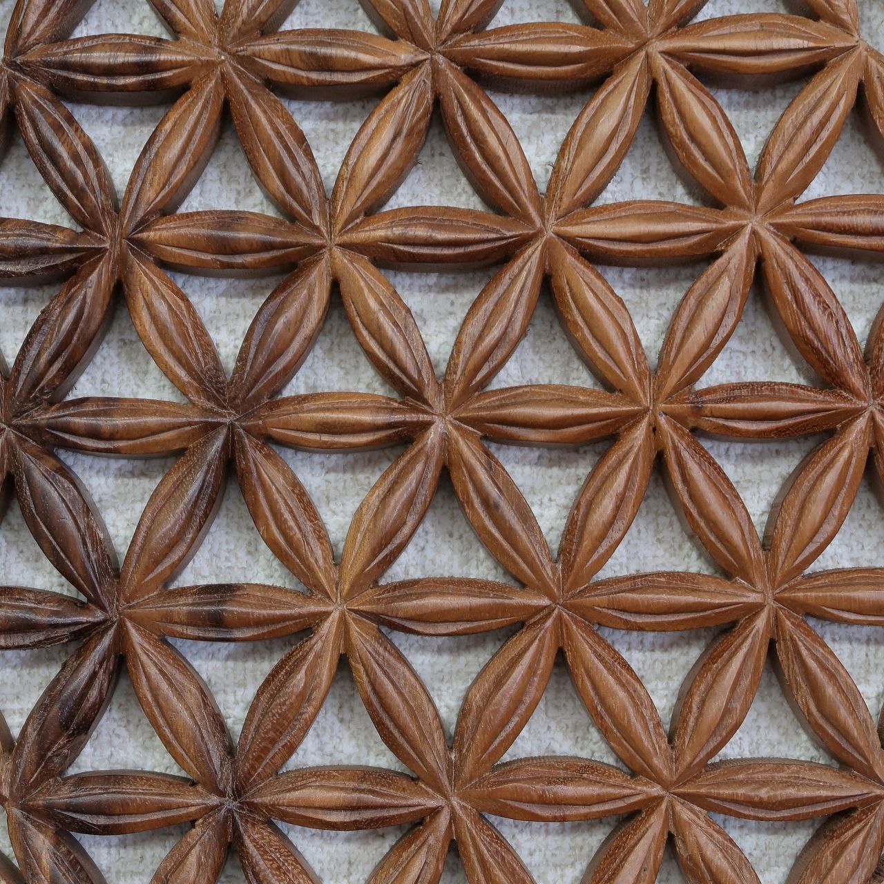 スワール無垢材の一枚板に手彫りで彫刻されたフラワーオブライフを彫刻した木彫りの壁掛けです。不思議な図柄にも見えますがフラワーオブライフの図柄は自然界に存在する黄金比で花びらが配置されていてエジプト~トルコ周辺の紀元前1,000年以上前の遺跡からも発見されており古くから「生命エネルギーを高める」といわれていたようです。ヨガをされている方へのギフトとしてもお勧めです。