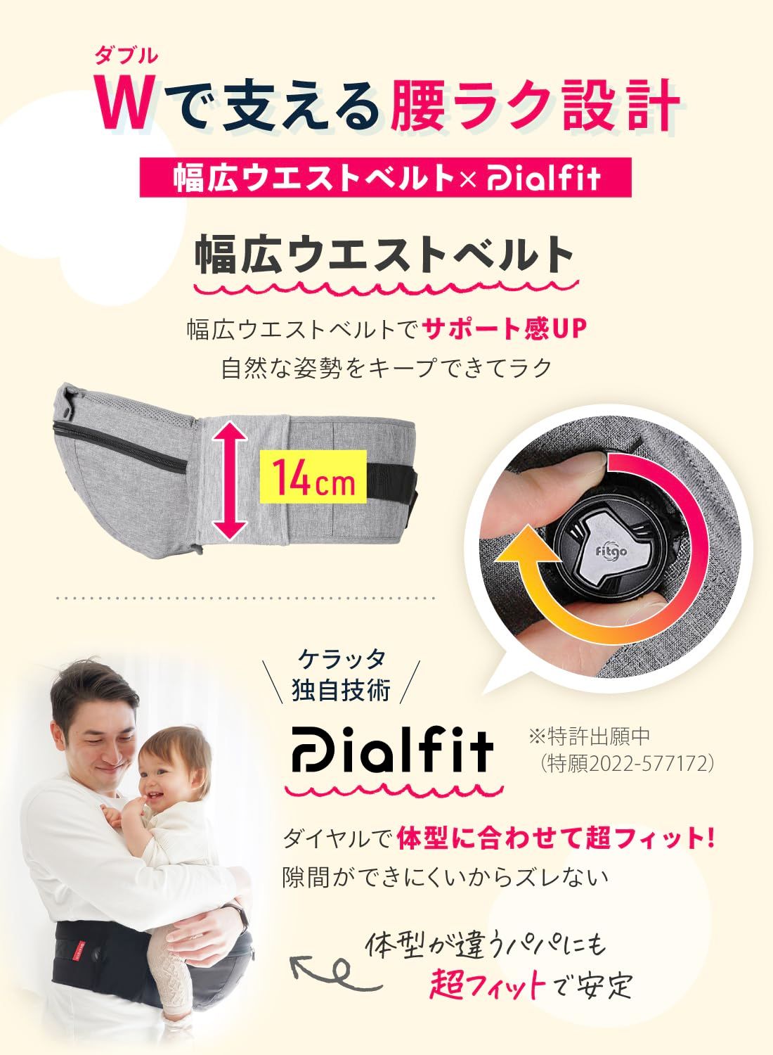 抱っこの悩みを解決!【ダブルで支える腰ラク設計】ダイヤルヒップシートは従来品よりウエストベルトの幅が1cmアップ!さらに、側面についたダイヤルを回すことで体型に合わせて超フィット!赤ちゃんの重みによるヒップシートのズリ落ちを予防し、抱っこ中も自然な姿勢をキープできてラク♪【もっちり台座でおなかがラク】「ヒップシートが下腹部に食い込んで痛い...」にはケラッタのもっちり台座付きウエストガードクッション!パパママのおなかにフィットするゆるやかなカーブで設計、さらにやわらかさと弾力のあるクッションをつけることでおなかにかかる負荷を分散し軽減します。【ダブルショルダー付きで叶える快適トライアングルで肩首がラク】ヒップシートに肩紐がついているから赤ちゃんの体重が肩・おなか・腰の3か所へ分散。パパママの体幹で支えることができるので安定感upでラク♪さらに肩クッションも従来品の1.5倍増量でもっちりパワーアップしたので食い込みにくいのがうれしい!