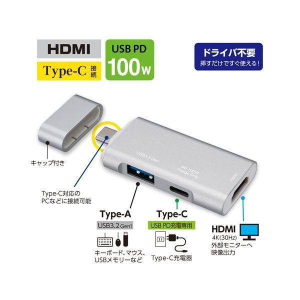 ●コネクタ形状:PC側/USBType-Cオス、接続機器側/USBAメス×1・Type-Cメス×1(PD充電専用)・HDMI(タイプA19ピン)メス×1