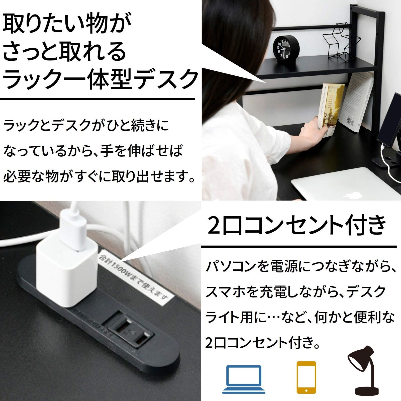 [山善] デスク 選べる幅 (幅90 幅110) ラック付き (左右入れ替え可能/A4対応/可動式棚板) 2口コンセント 天板耐荷重60kg 奥行49×高さ112cm パソコンデスク 組立品 ブラック DWRE-1150R(BKSBK) テレワーク