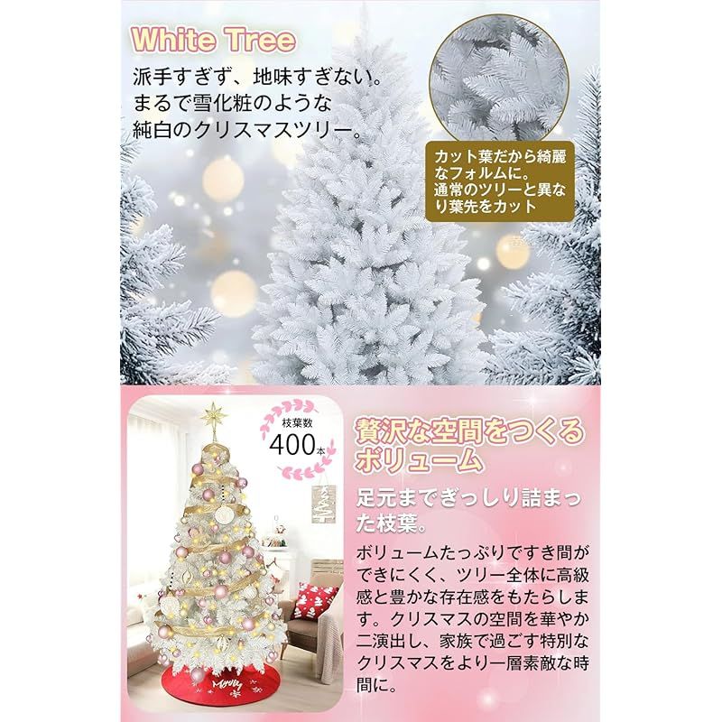 【白いクリスマスツリー!&贅沢なボリューム感を演出】150cmタイプのホワイトカラーが美しいクリスマスツリーです。オーナメントやリボン、LEDライトがセットで付属するため、飾りつけを楽しみながら設置することができます。通常のツリーとは異なり葉先がカットされて綺麗なフォルムになります。安心なPVC素材で作れる葉が無味無臭で、落ちにくて耐久性に優れています。枝数が400本で、中の軸が見えにくく、モコモコと見た目も豪華で、飾りつけもしやすいです。全長150cm、ご家庭のリビングや玄関はもちろん、カフェやショップに飾るのにぴったりな大きさ。 置くだけで一気に空間をクリスマスムードにしてくれます。