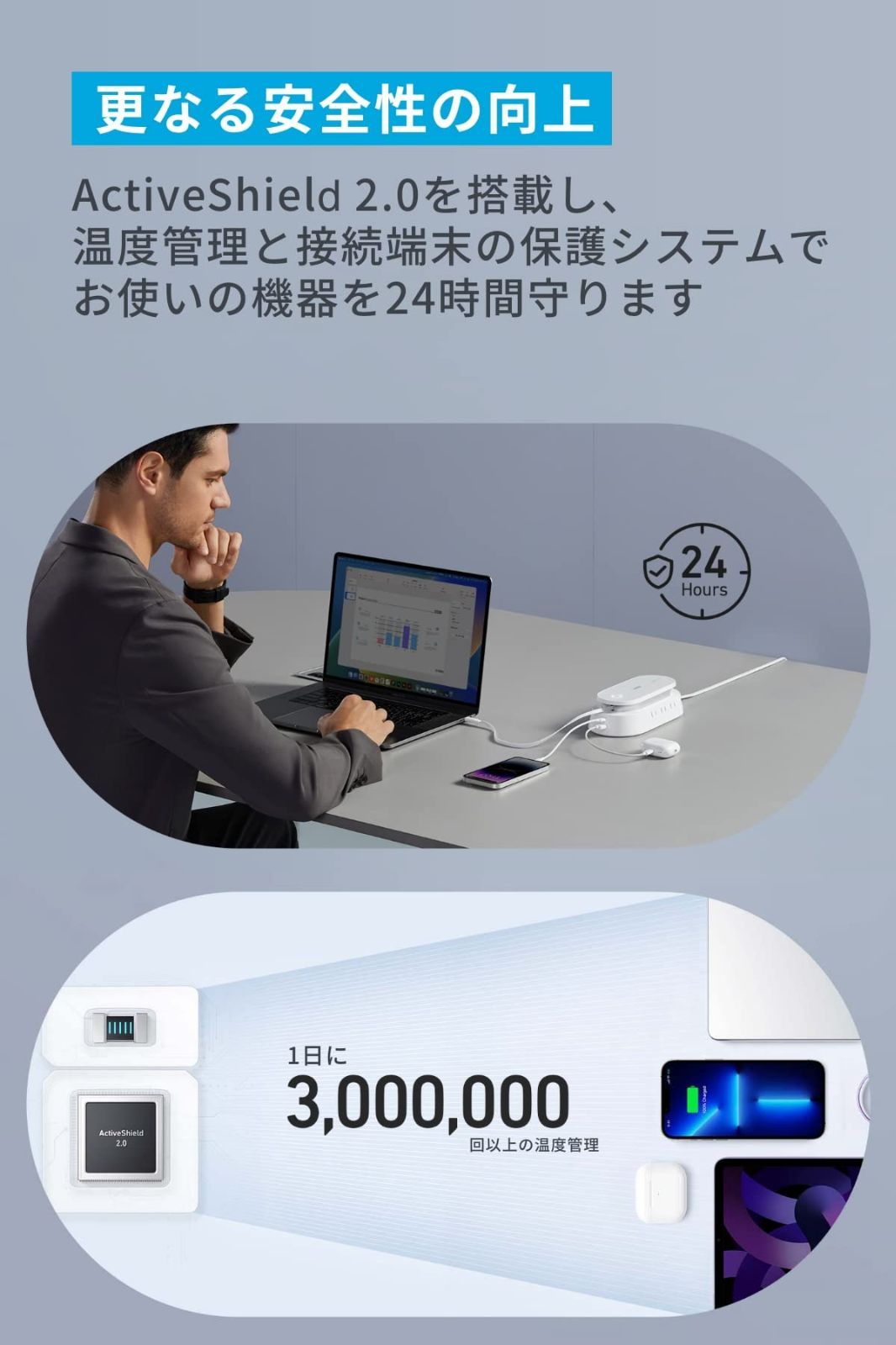 高い安全性: 従来製品と同じ多重保護システムに加え、ActiveShield 2.0により優れた安全性を実現。独自の温度管理と接続端末の保護システムでお使いの機器を24時間守ります