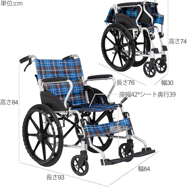 車椅子 自走式 介助式 兼用 アルミ製 軽量 折り畳み コンパクト 車イス 背折れタイプ 折りたたみ式 簡易 軽量車椅子 20インチ ノーパンクタイヤ 組み立て不要 介助介護用品 外出 旅行に適用 青&赤チェック柄
