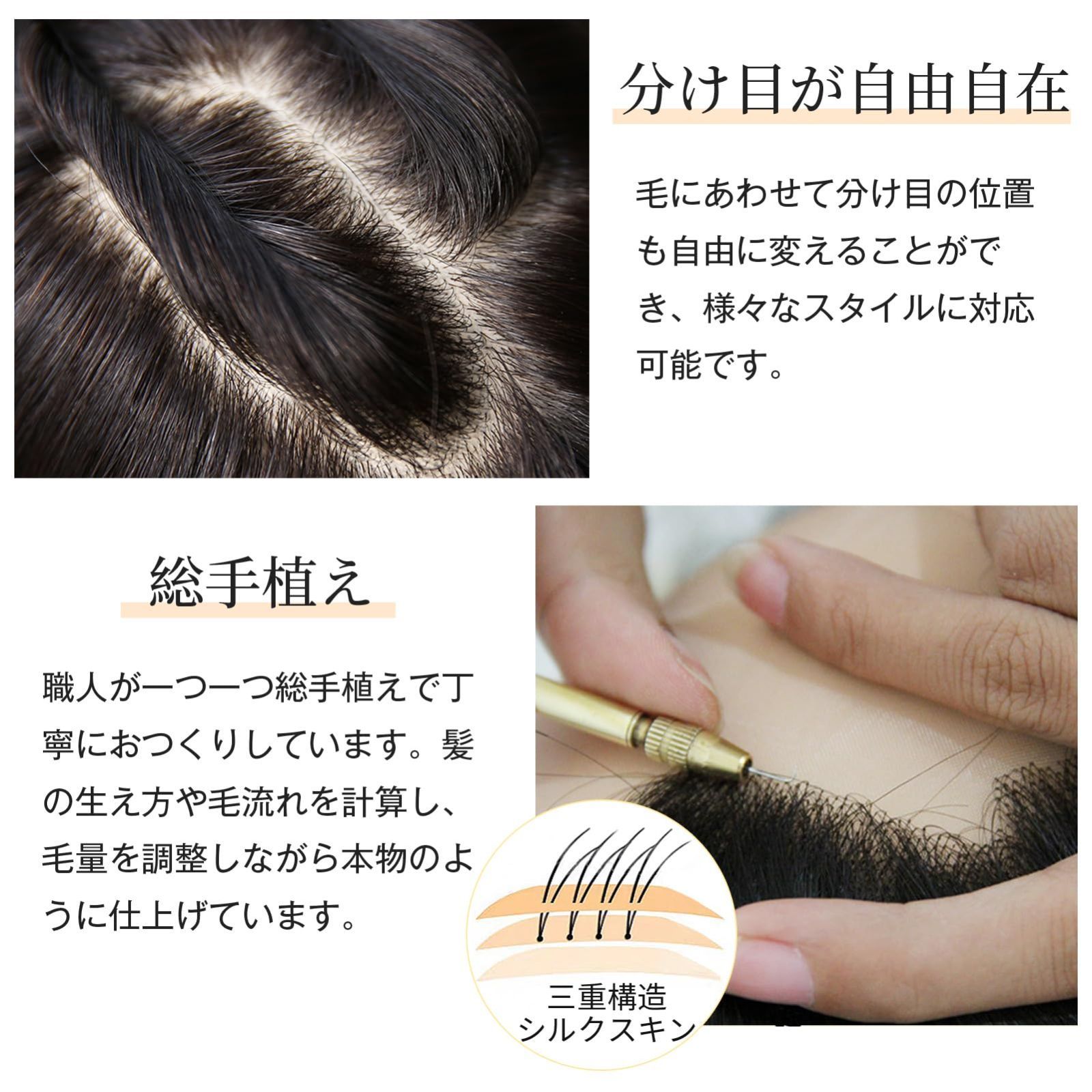 人毛100%:人毛100%の部分ウィッグは、自毛との馴染みが良く、テカリや質感が非常に自然です。人毛ならではの触感や動き、光の反射が、化学繊維製ウィッグとは異なり、よりリアルで本物らしい印象を与えます。