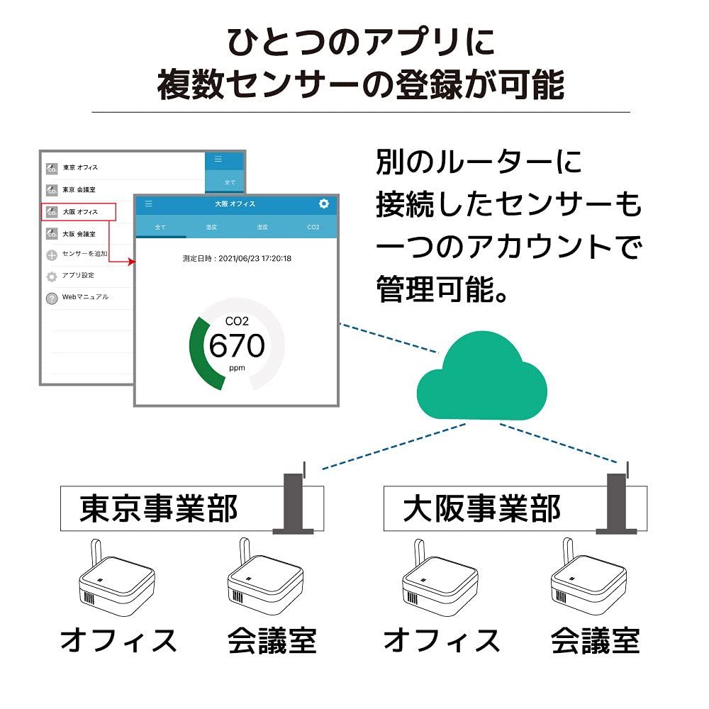 CO2センサー搭載設定レベルを超えるとスマホへ通知計測値はクラウドへ保存、CSV出力可能