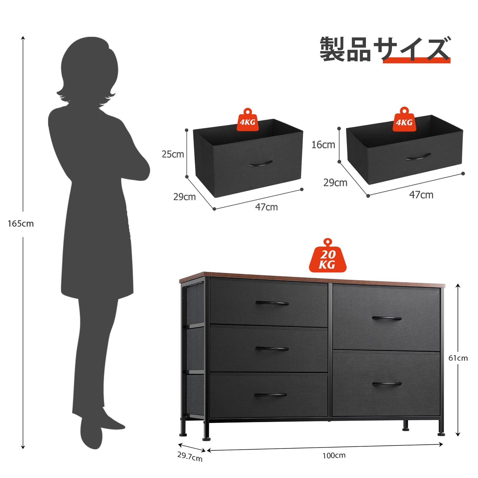 色: ブラック_サイズ: 奥行30cm x 幅100cm x 高さ61cm (引き出し数 5)