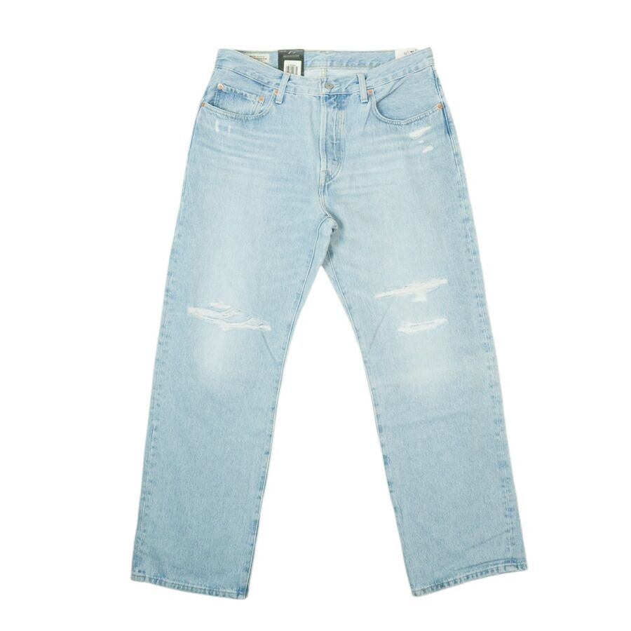 1873年以来のオリジナルのジーンズ501。ミッドライズ、ヒップから腿はゆるめのストレート。5ポケット、ノンストレッチのコットンデニムで、ヴィンテージ感のあるライトブルーが合わせやすい1本です。コットン100%