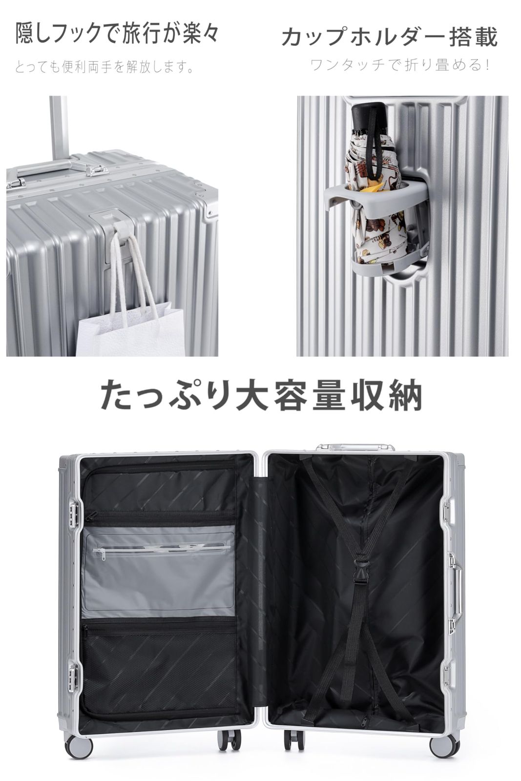 Spyplan スーツケース 大型 キャリーケース Mサイズ 3泊4日 軽量アルミフレームタイプ 大容量 機内持ち込み キャリーバッグ 隠しフック機能 静音ダブルキャスター 耐衝撃 TSA ロック カップホルダー付き 旅行 ビジネス 出張 人气 シルバ