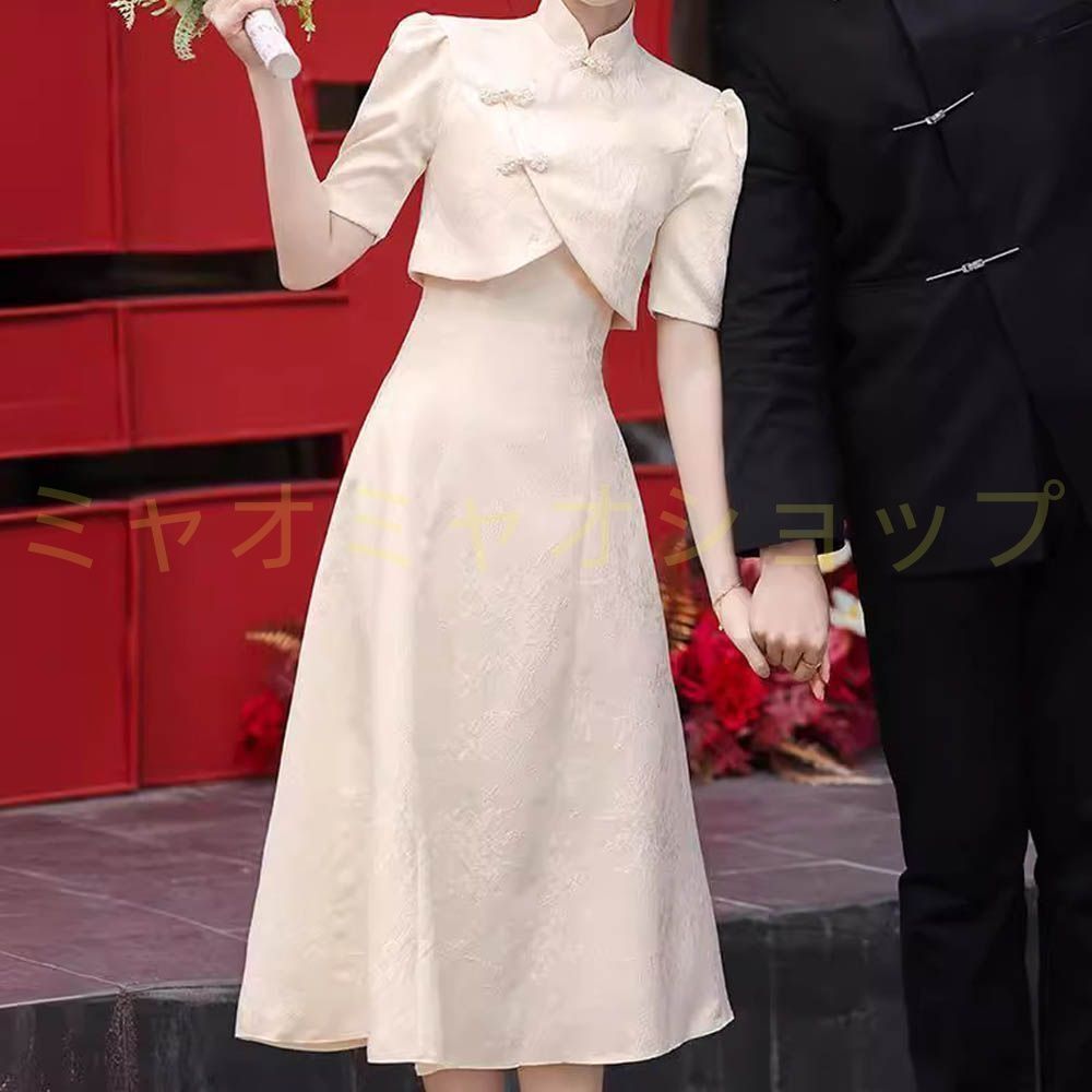 チャイナドレス シャンパン 花柄 ツーピース 半袖ショートボレロ付き 立ち襟 着痩せ 膝丈 フ スカート お洒落 ワンピース レディース フォーマル パーティー 二次会 1092