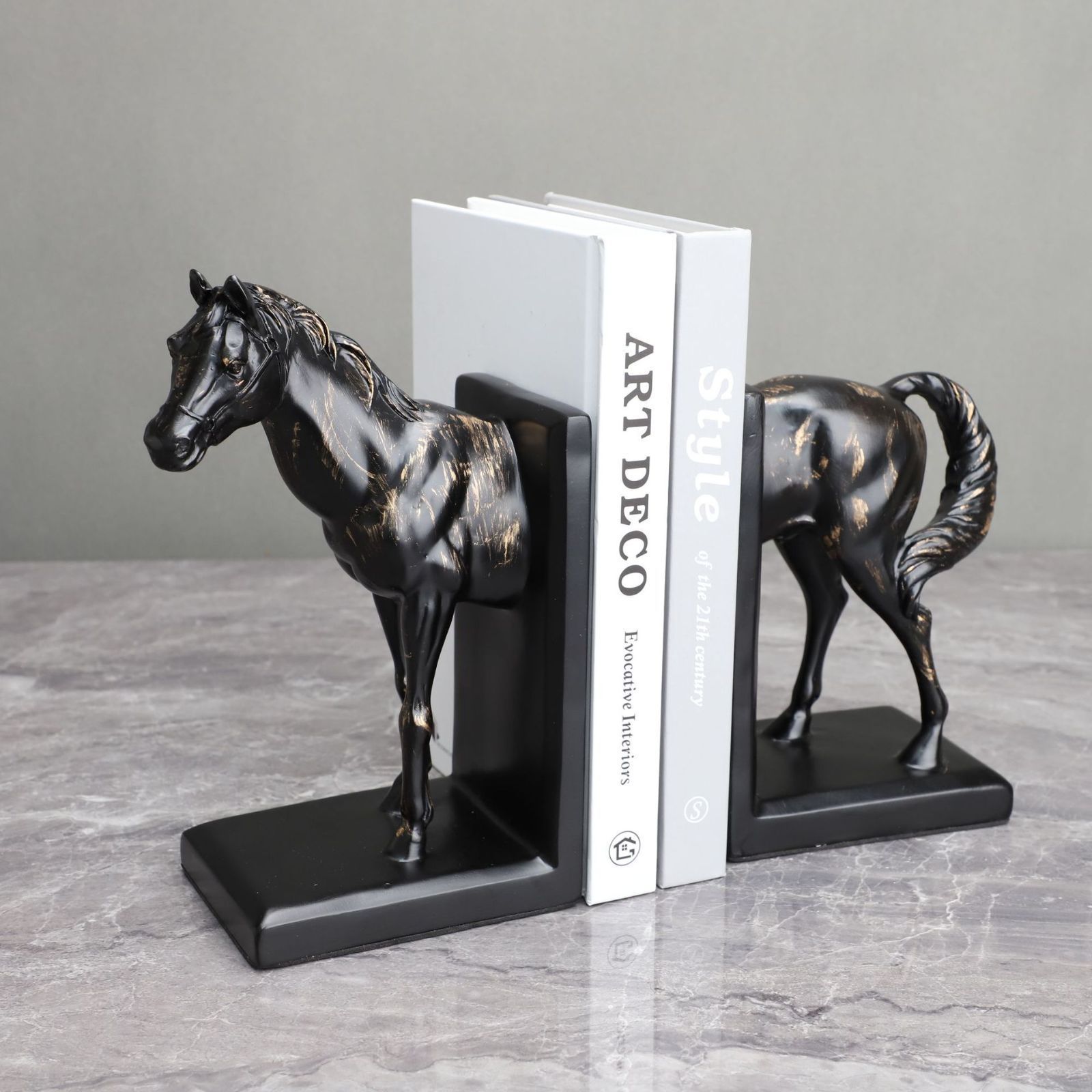 ヨーロピアン風のブラック仕上げ馬型ブックスタンドは、サンプルルームからオフィス、寝室、書斎、リビングルーム、ダイニングテーブル、玄関など、さまざまな場所で活用できる工芸品です。
