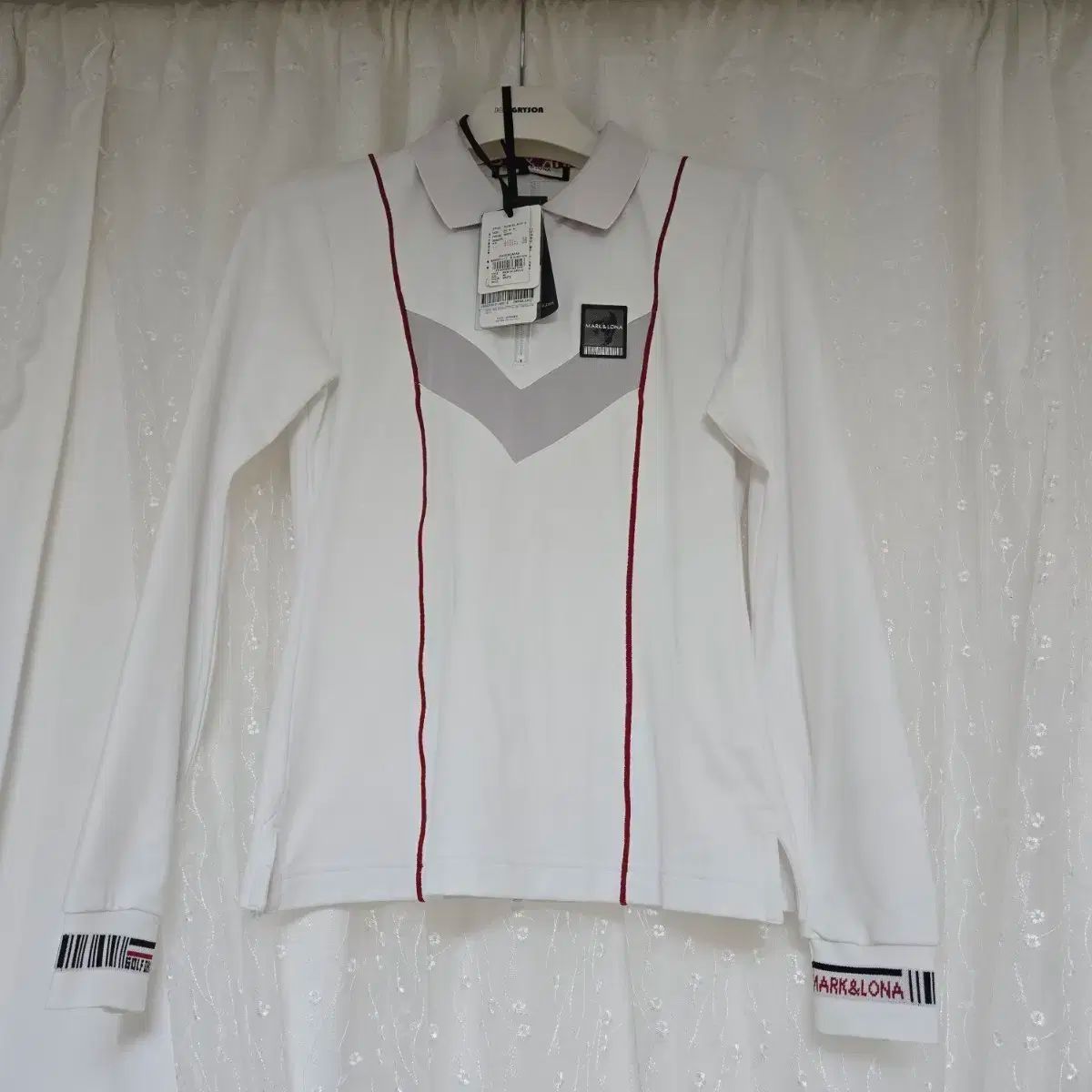 タグ付き MARK & LONA マークアンドロナ レディース ゴルフウェア 長袖Tシャツです。白 カラーに POINT ポイント LINE が入っており エレガントな感じを与えます。袖 部分に MARK & LONA マークアンドロナ ロゴが入っています。