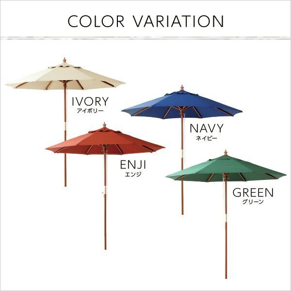 説明天然木木製パラソル210cm【ソナタ-SONATA-】パラソル撥水天然木パラソルは柄と組み合わせるだけの完成品!傘の生地にはポリエステル生地の撥水加工で安心!見た目が美しい天然木支柱!カラーは選べる4色展開!