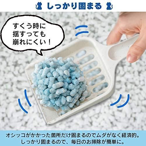 商品紹介 溶けやすくそのままトイレに流せる猫砂です。 トイレットペーパーでも使われる再生パルプを使用。 トイレに詰まりにくく、いつでも流せて衛生的です。 タンクレスタイプや節水型のトイレでも安心して流せます。 単独浄化槽には流せません。 もちろん燃えるゴミに出すことも可能です。 袋が自立するスタンドタイプです。 封を開けたあとも袋が自立するので収納がしやすく、側面が注ぎ口になるので猫砂の補充もラクラク。 【掃除がしやすい 3Point】 1.オシッコした場所の色が変わる オシッコした部分は青く色が変わるので、取り逃しがなく、オシッコの量もわかりやすい。 2.しっかり固まる オシッコがかかった箇所だけ固まるのでムダがなく経済的 3.飛び散りにくいペレットタイプ 粉だちしにくく猫砂がとびにくい、大きめなペレットタイプ 肉球の間に挟まりにくく飛び散りにくい 原材料・成分 主原料:再生パルプ