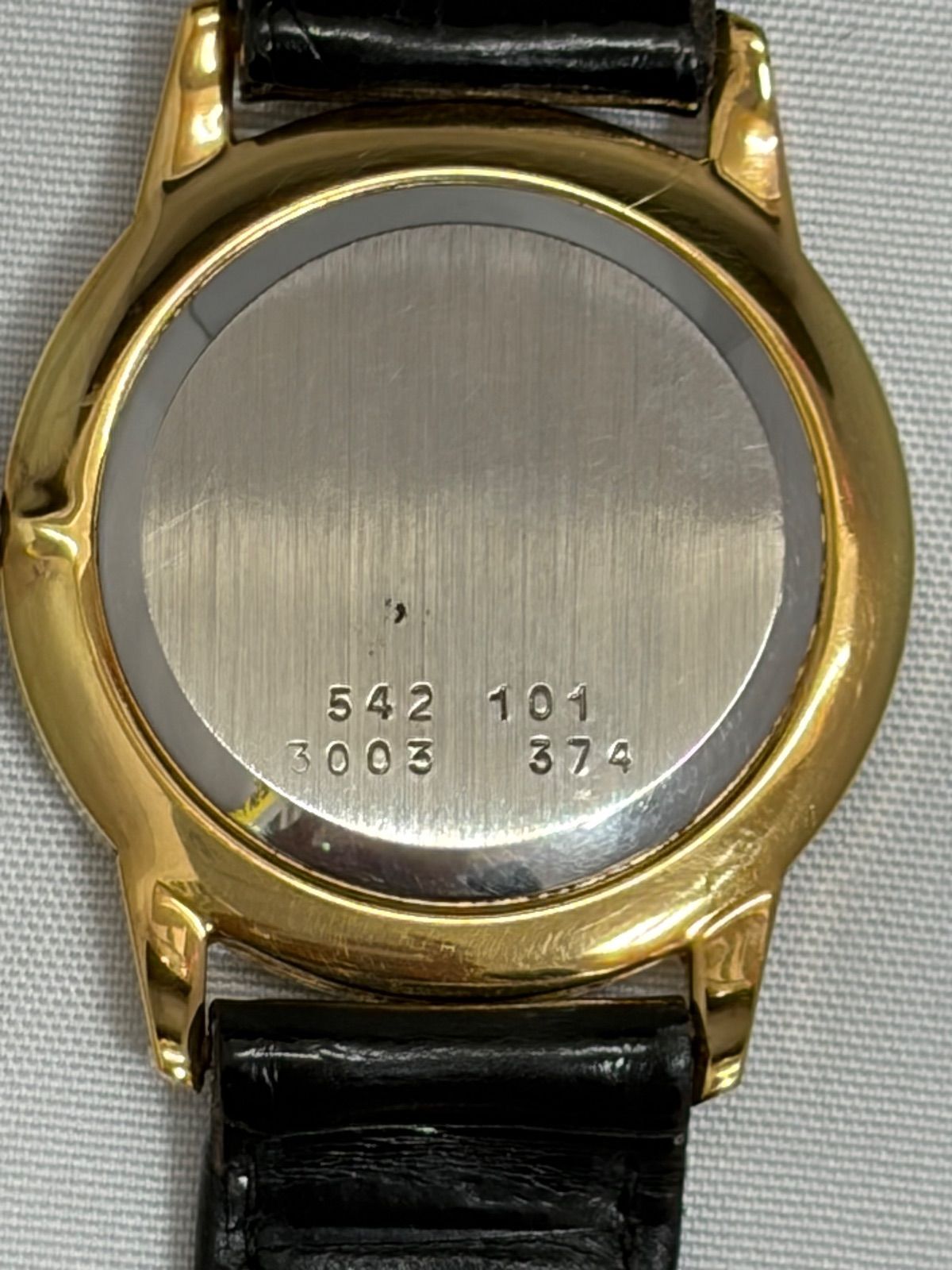 新品につき、多少の小傷等、リューズに変色が有ります。年代物にしては、全体的に良い状態です。動作確認済み。箱(スレ、キズ、変色有り)、ケース、保証書付き。