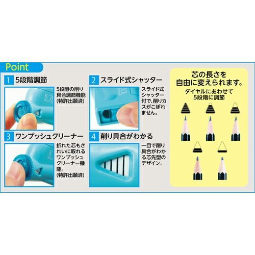 芯の長さを5段階に調節できます。スライド式シャッター付きで削りカスがこぼれません。折れた芯もきれいに取れるワンプッシュクリーナー機能が付いています。【検索ハッシュタグ】#シャープナー#鉛筆削り