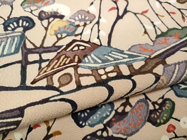 平和屋着物 上質な小紋 型染め 風景草花文 鬼しぼ縮緬 正絹 ut