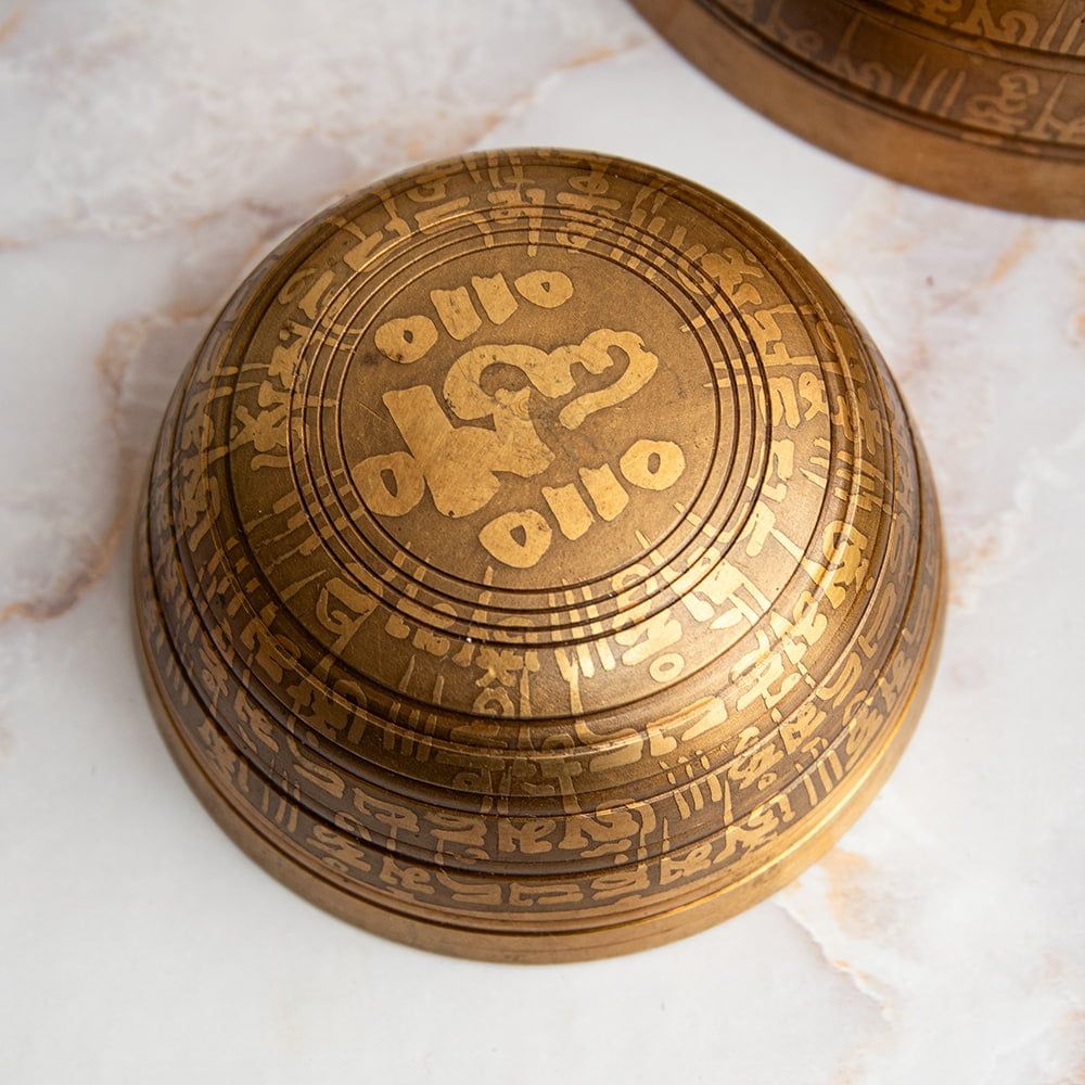 側面と内側にオンマニペメフム(真言)がエッチング装飾された非常に美しいシンギングボウルのセットが入荷しました。「オンマニペメフム(OmManiPadmeHum)」は、チベット仏教における非常に有名な真言(マントラ)です。このマントラは、観音菩薩(チベットではチェンレジー、Avalokiteshvara)のマントラであり、慈悲や悟りを象徴しています。また、「蓮華の中の宝石よ、輝け」というように解釈されることが多く、その意味でもとても美しいですね。