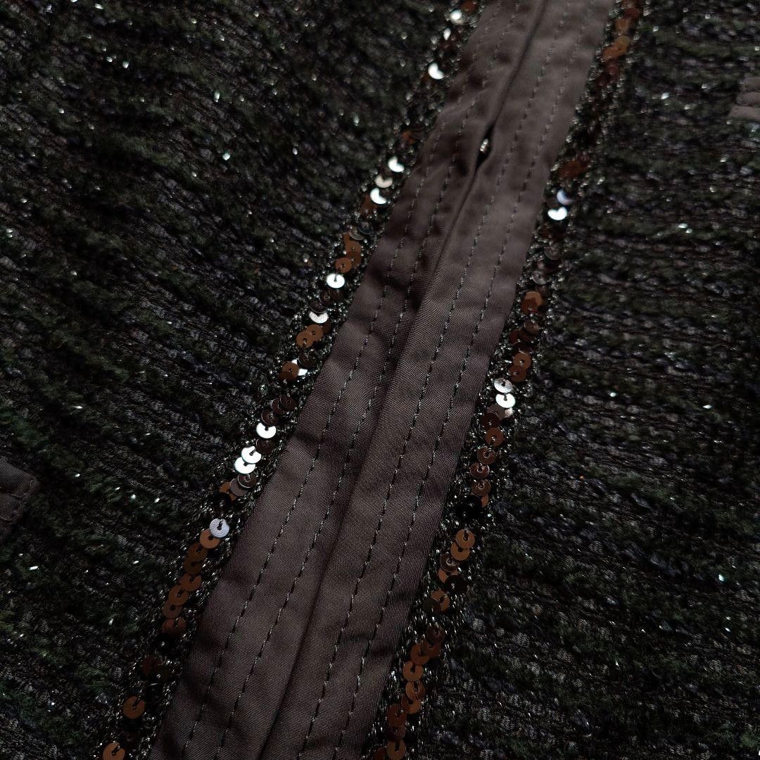 華やかでありながらも落ち着きのある黒のツイード生地は、わずかにラメが織り込まれており、光の加減で上品にきらめきます。ノーカラージャケットの襟元から前立て、ポケット部分にあしらわれた白のパイピングと装飾が、全体をぐっと格上げし、洗練された印象を与えます。