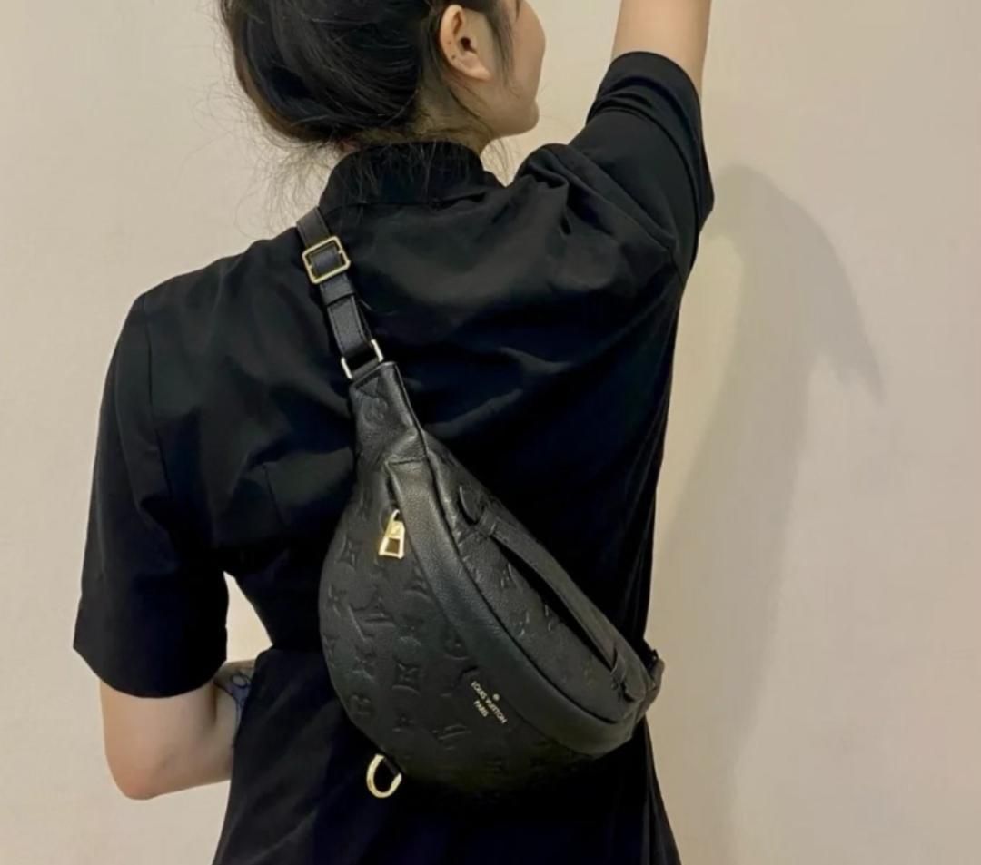 定番のブラックショルダーバッグ、オシャレでどんなコーデにもぴったり!大きく開くデザイン。
