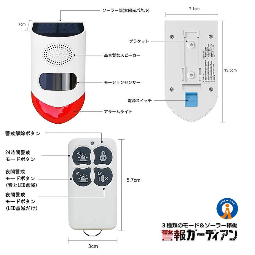セット 警報ガーディアン 防犯アラーム 大音量 リモコン搭載 ソーラー 人感センサー ブザー LED 警報機 120 dB 太陽光充電 防水 動物撃退 KEGADIAN 宅配ヤ