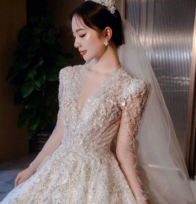 華やかに輝くロングトレーン付きゴージャスウェディングドレス