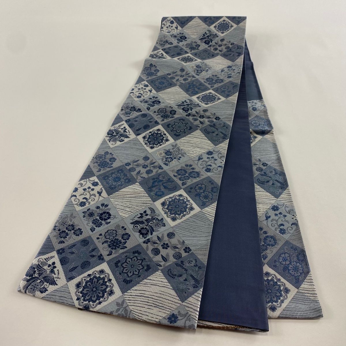 袋帯 秀品 草花 斜め格子 青灰色 六通 正絹