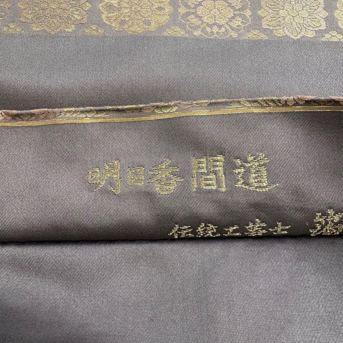 袋帯 箔屋清兵衛 落款 明日香間道 華文 草花 本金箔 灰紫 お太鼓柄 正絹