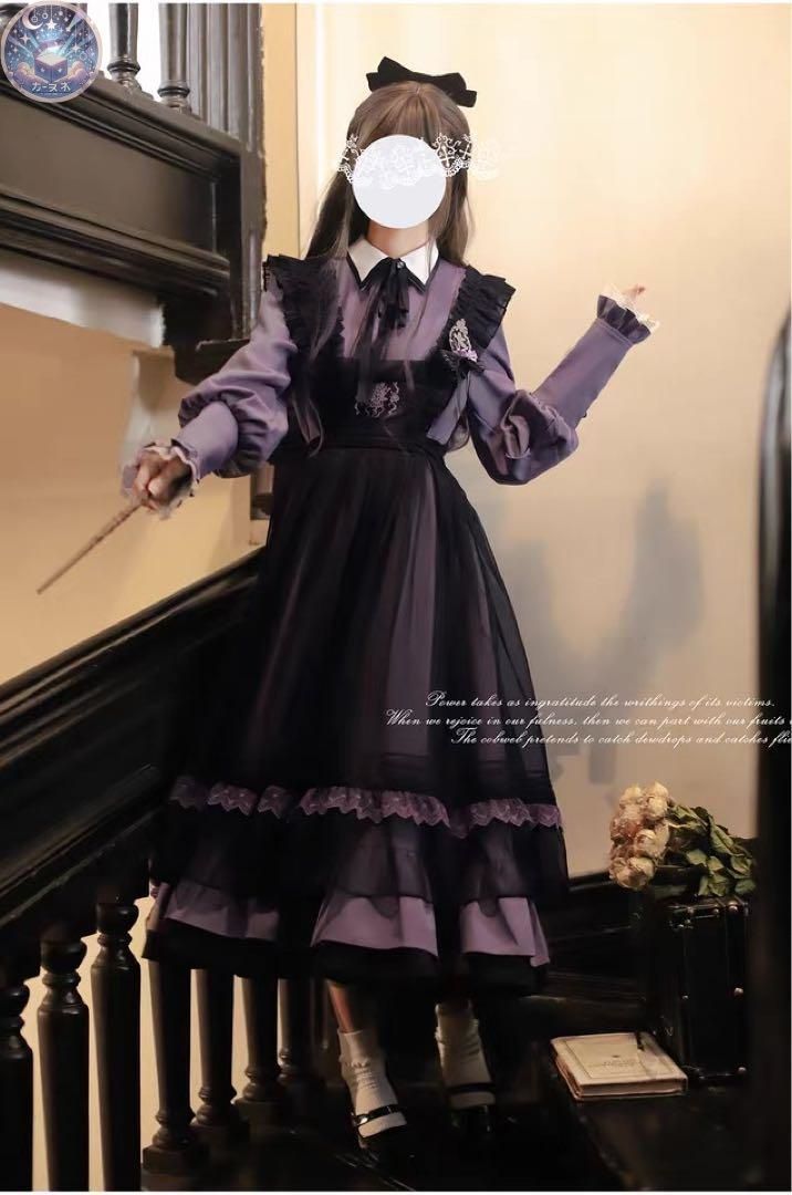 魔女学院 クラシカルロリィタ ロングワンピースセット エプロン 刺繍 パープル
