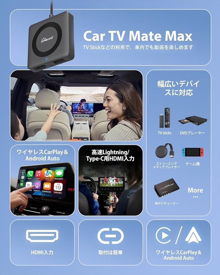 機能:(1)ワイヤレス CarPlay,(2)ワイヤレス Android Auto,(3)車にHDMI入力が無くてもTVStickなどの動画を楽しめる,(4)本製品単体では映像やテレビの視聴はできません。