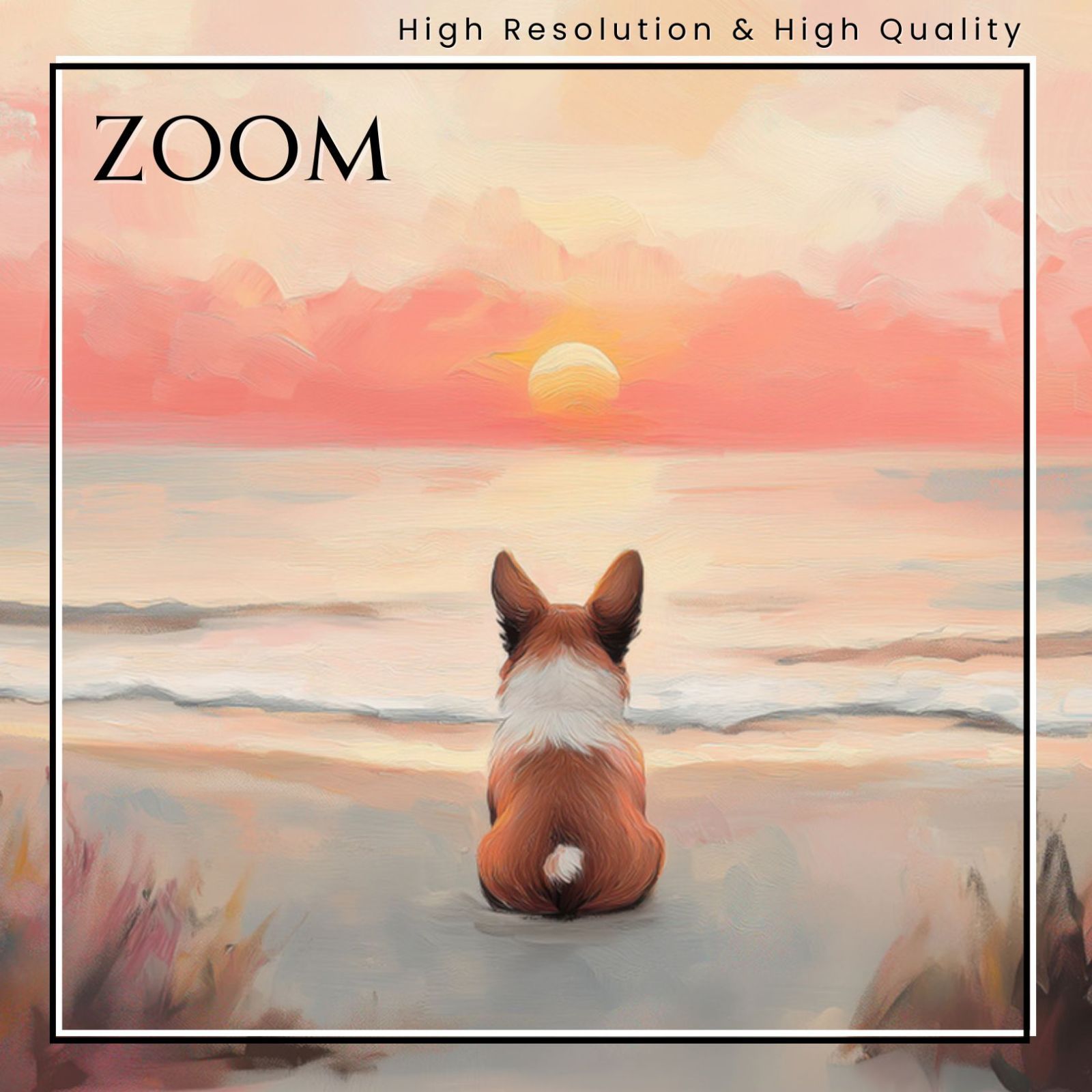 【サマーバケーション】は、サンセットビーチで(日の出・朝日・夕日・夕焼け)を眺める、ウェルシュコーギー犬の優しく心癒されるアートポスター作品です。