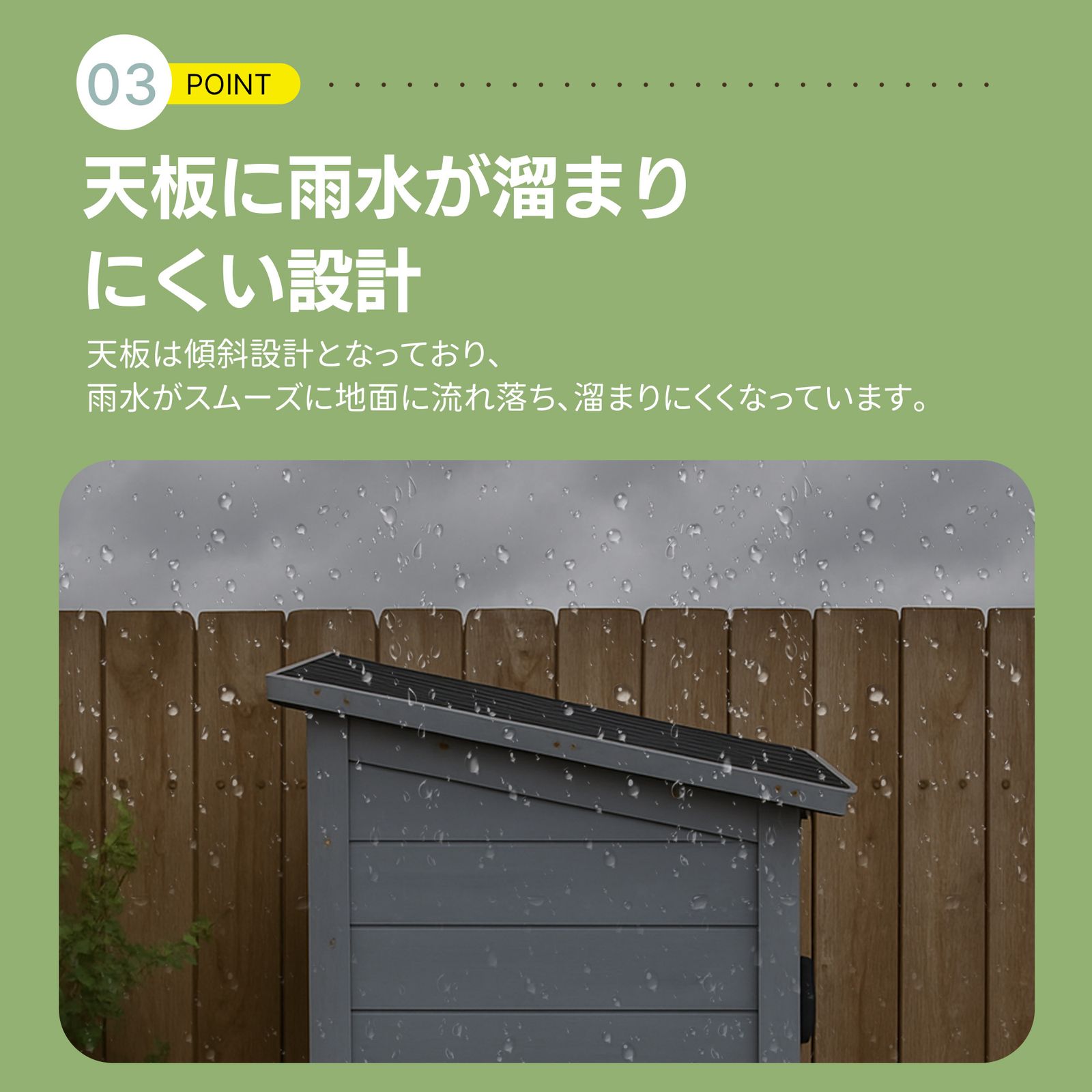 ◎04【天板に雨水が溜まりにくい設計】天板は傾斜設計となっており、雨水がスムーズに地面に流れ落ち、溜まりにくくなっています。