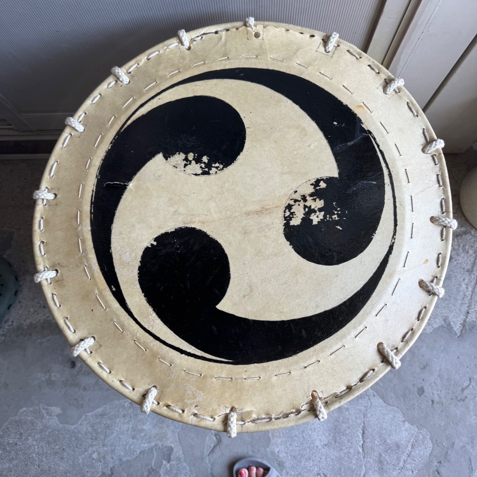 革には力強い「巴紋(ともえもん)」が描かれており、舞台映え・祭礼の演出にも最適です。