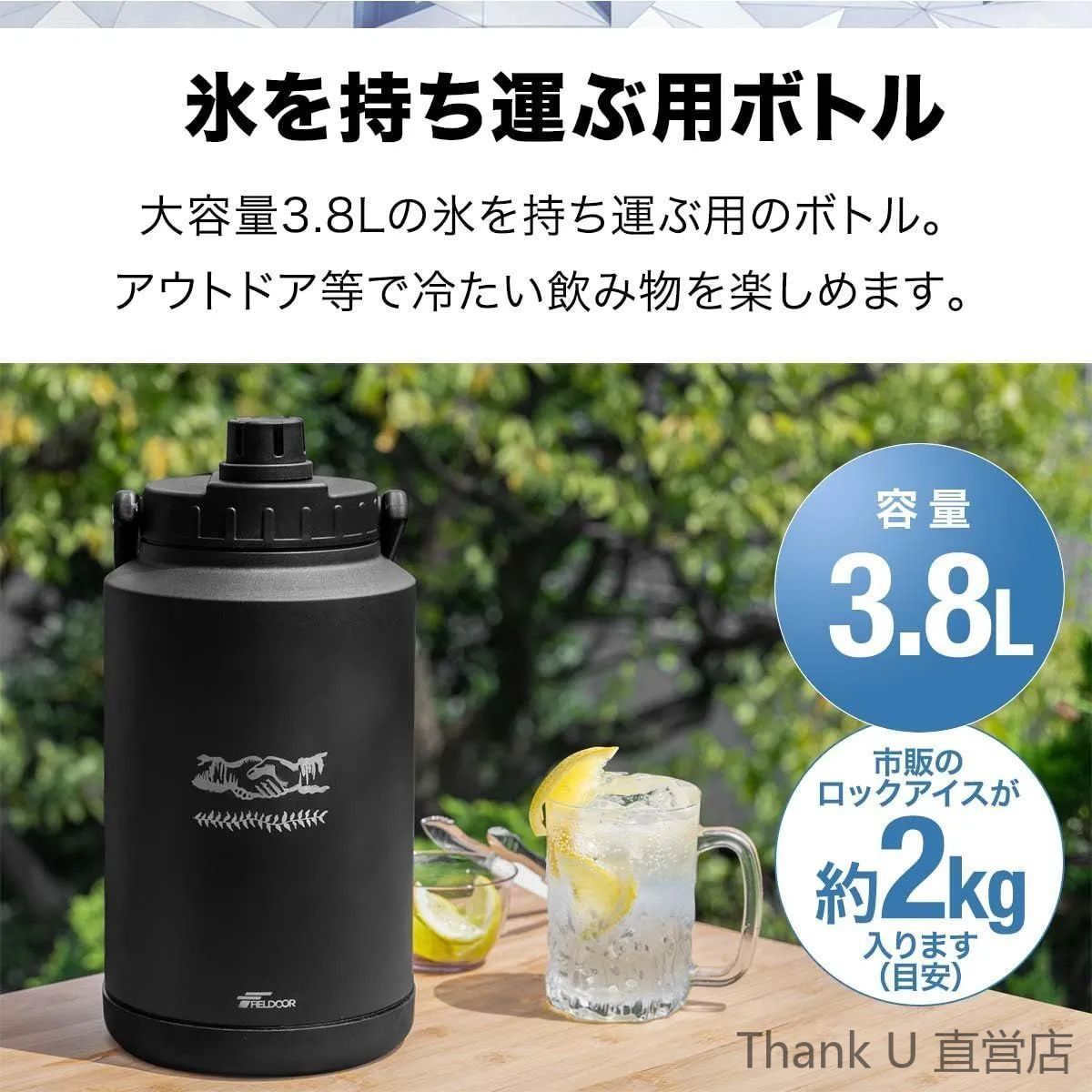 【大容量!アウトドアで冷たい飲み物を楽しむ】大量の氷を持ち運べるアイスボトル。アウトドアやレジャーで冷たい飲み物を楽しむのに最適です。容量は3.8L、市販のロックアイス約2kgが入るサイズです。