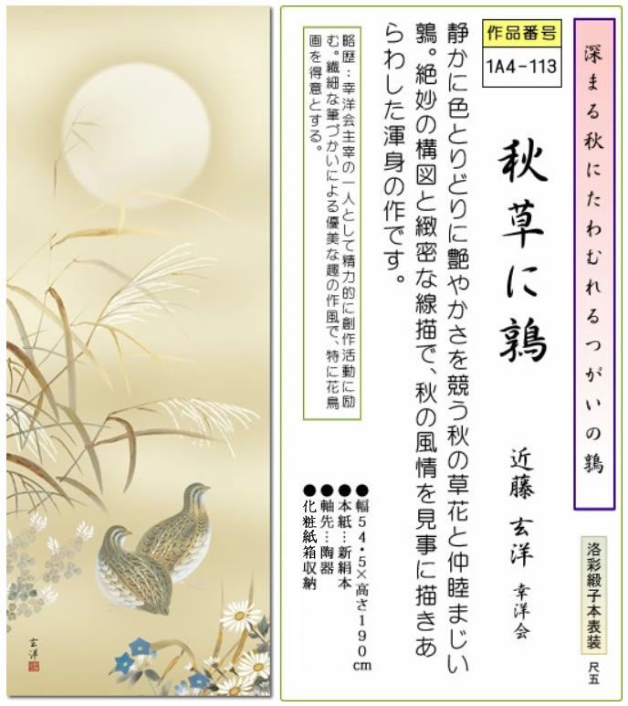品 掛け軸-秋草に鶉 近藤玄洋 尺五 床の間 和室 モダン お洒落 日本画 贈答 ギフト 表装 壁掛け