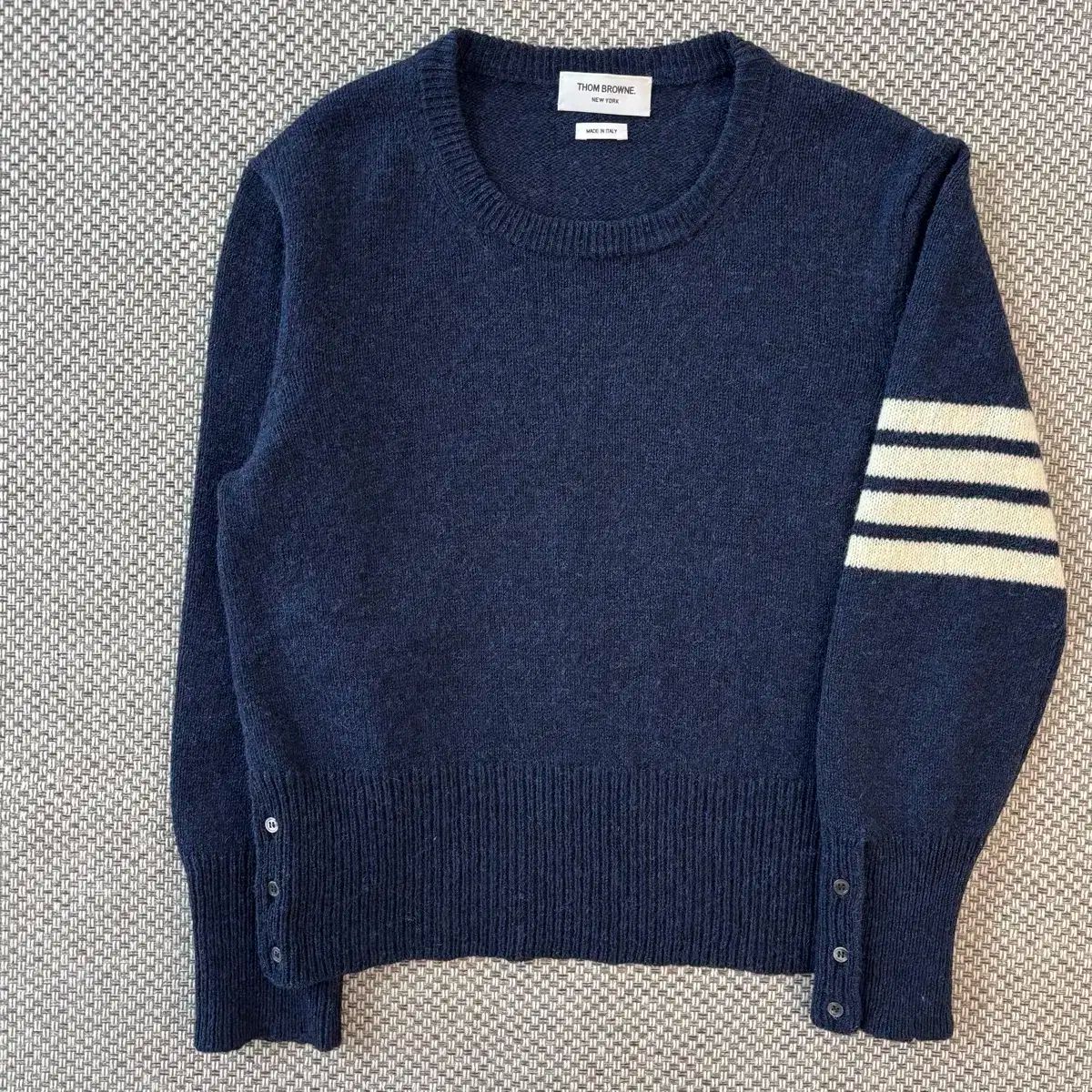 これはトム・ブラウンの斜め腕章のシェットランドニットです。