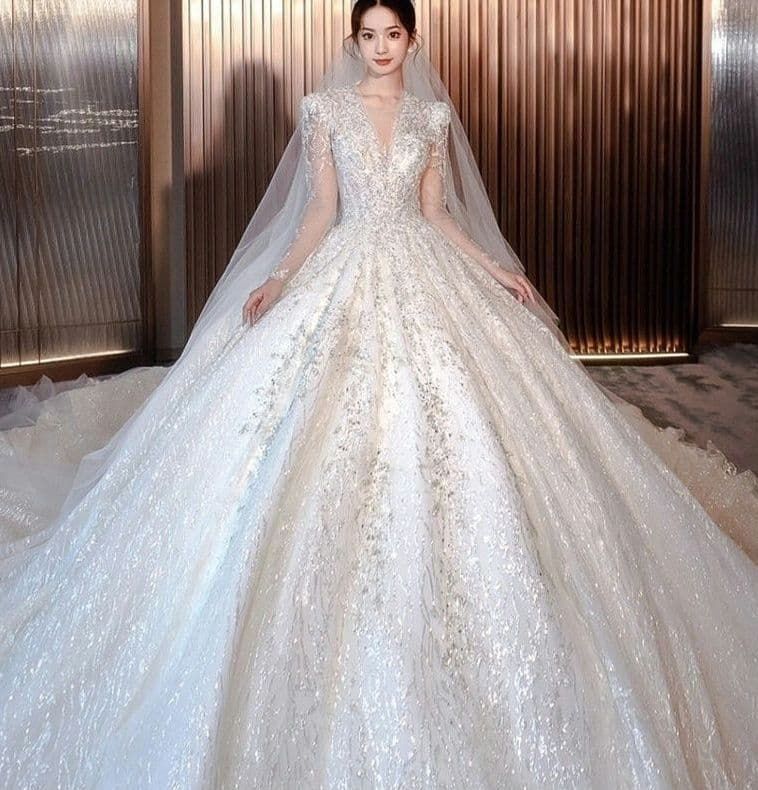 華やかに輝くロングトレーン付きゴージャスウェディングドレス
