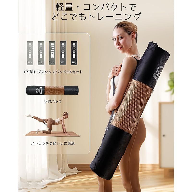HAPBEAR コルクヨガマットの特徴:特大サイズ(183cm×92cm)で広々使用可能。両面滑り止め加工で汗でもグリップ力UP。6mmの厚みで関節保護。天然コルク&TPE素材でエコフレンドリー、抗菌・防臭効果あり。水拭き簡単で手入れ楽々。軽量キャリーバッグ付きで携帯便利。ヨガ、ピラティス、ストレッチに最適。