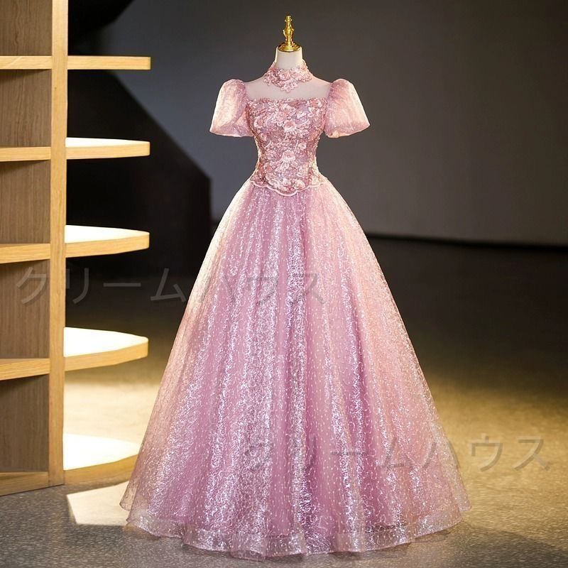 ドレス 編み上げ ピンク パフスリーブ ロングドレス 結婚式 二次会 発表会 演奏会 ウェディングドレス ウエディング