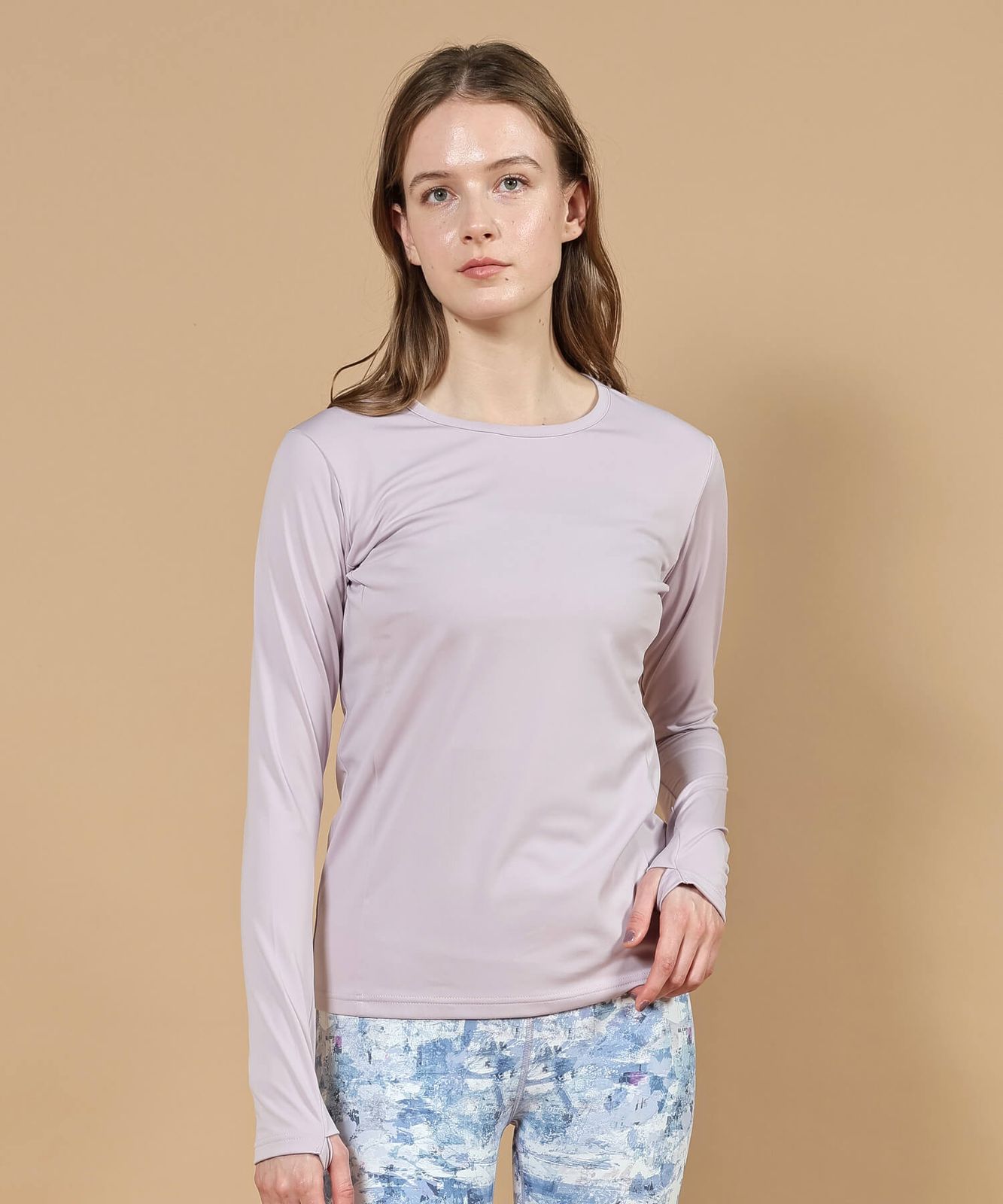デコルテの露出を抑えつつ、脇下からの縦ラインの切替が自然と着るだけでスタイルアップが叶います。手の甲までカバーできるサムホール付きで、肌寒い季節やワークアウト時にも頼れる一枚です。タイトなシルエットは重ね着にも最適で、ラッシュガード代わりとして水辺でも活躍。同素材のボトムと合わせれば、統一感のある洗練されたスタイルが完成します。