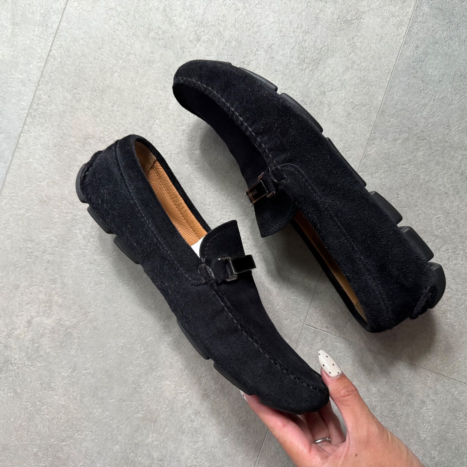 PRADA プラダ ドライビングシューズ ローファー ロゴプレート ブラック シルバー金具 スエード スリッポン 6 1 2 26.6 cm メンズ靴
