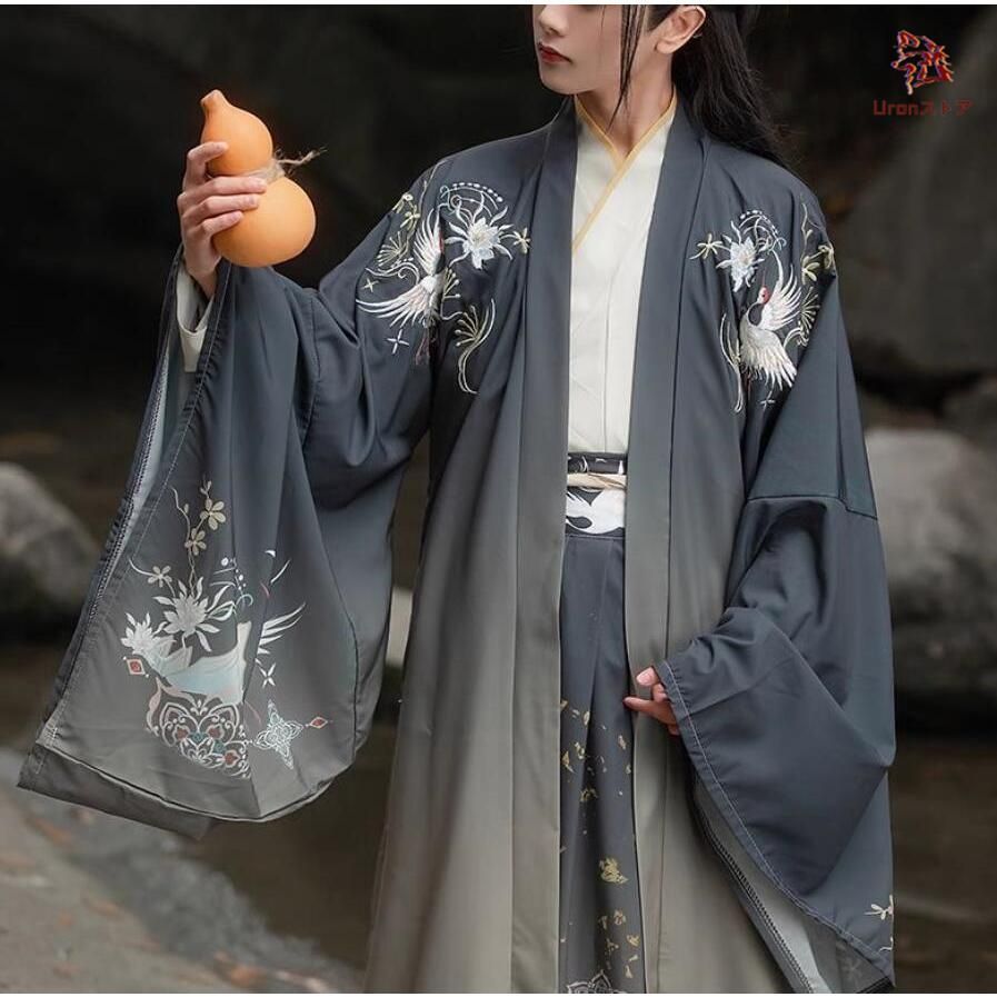中華コスプレ衣装 羽織付き3点セット メンズ チャイナ服 漢服 暗色系 グラデーション 中華服 交差襟 花 タンチョウ 鶴 刺繍 プリント 大人