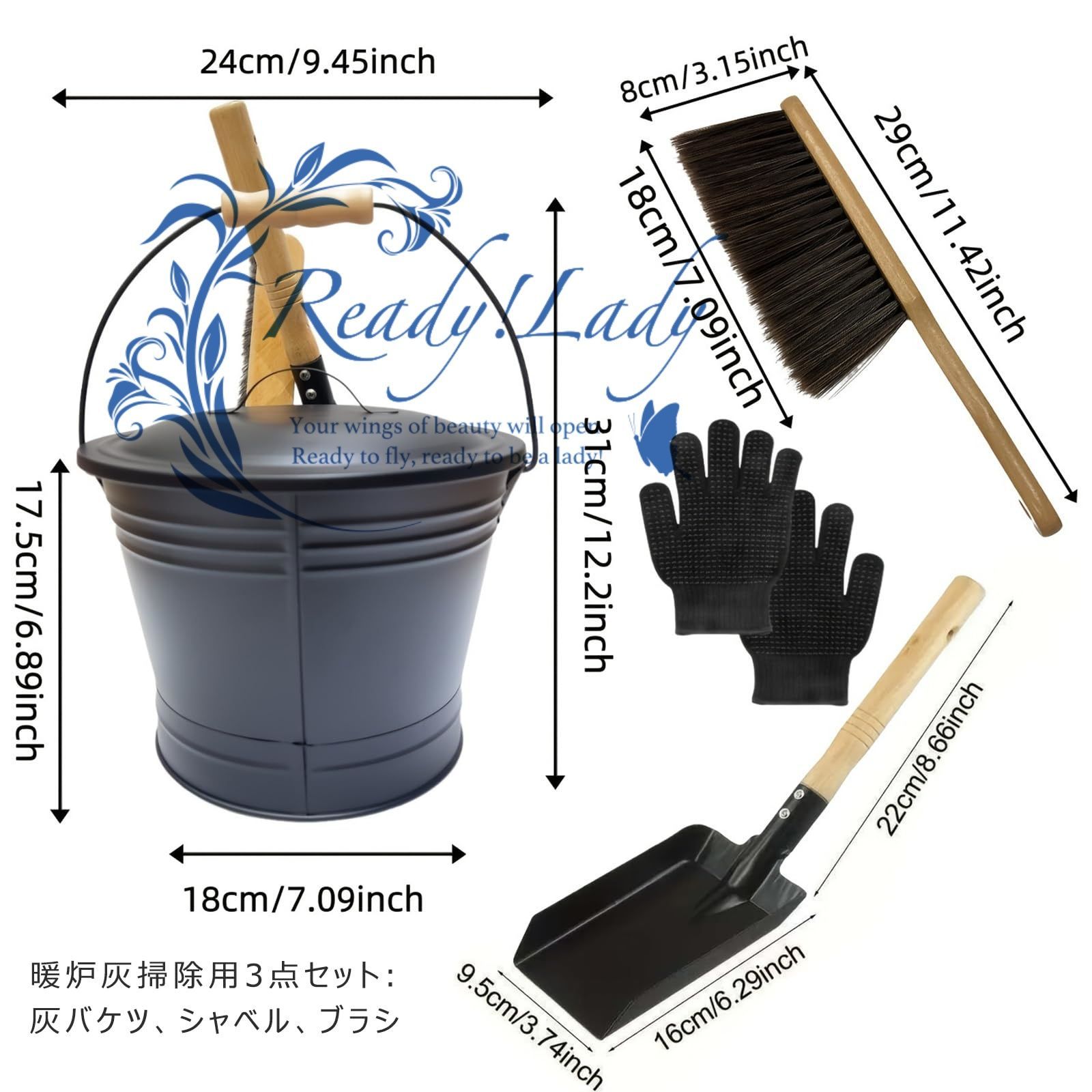 灰入れバケツ 壁炉用 灰受けバケツセット 5 L 高耐熱鉄製 灰 |蓋 シャベル ブラシ 手袋付き|焚き火台 グリル 薪ストーブ対応|灰収容 運搬 清掃一括ソリューション