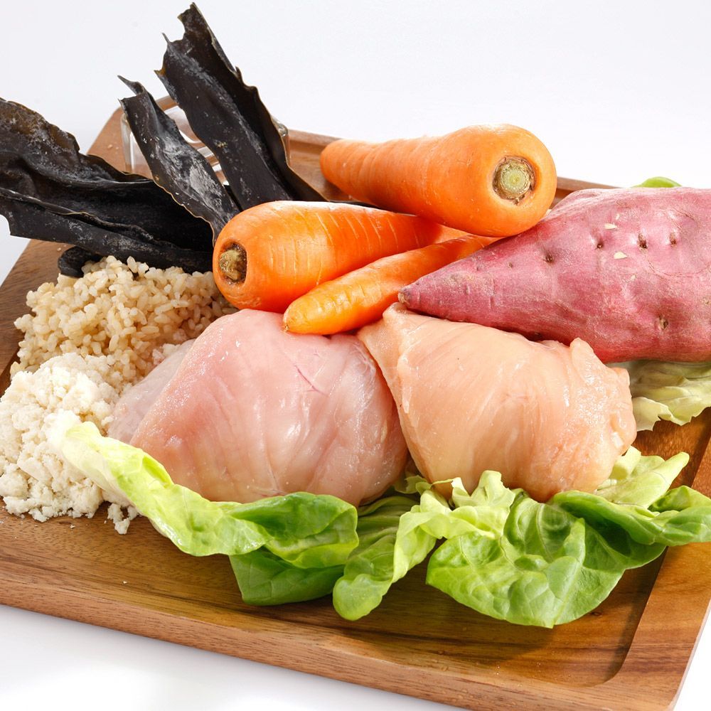 コクのある伊勢赤どり、鮮度の高い朝びき鶏をはじめ、野菜や穀物など日本各地から確かな品質の食材を調達。「茹でる」「炊く」などの下調理をした後、食材の栄養素を壊さぬよう、低温でじっくり乾燥させました。だしのような香りに、サラリとした手触り。食材そのままを活かした、やさしい味わいのドライフードです。