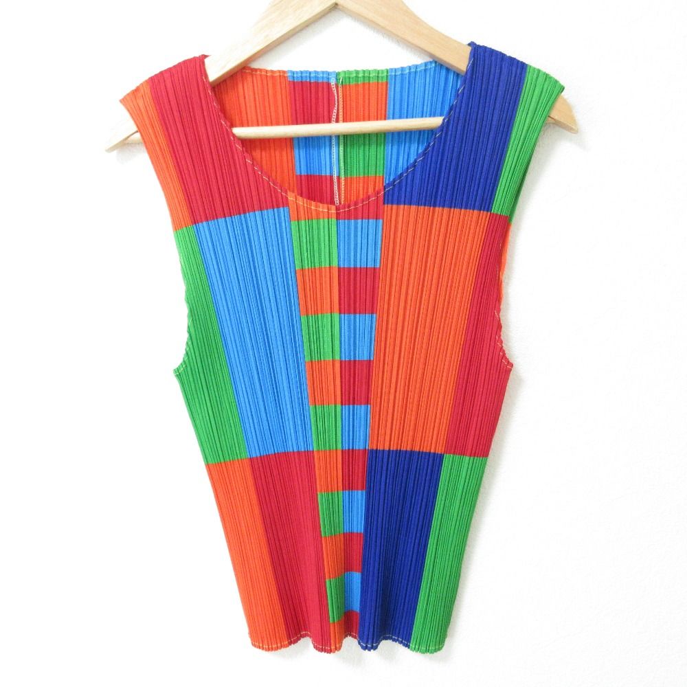 PLEATS PLEASE プリーツプリーズ イッセイミヤケ 総柄 ノースリーブ シャツ プルオーバー PP 14-JK 353 サイズ3 マルチ レディース 古着